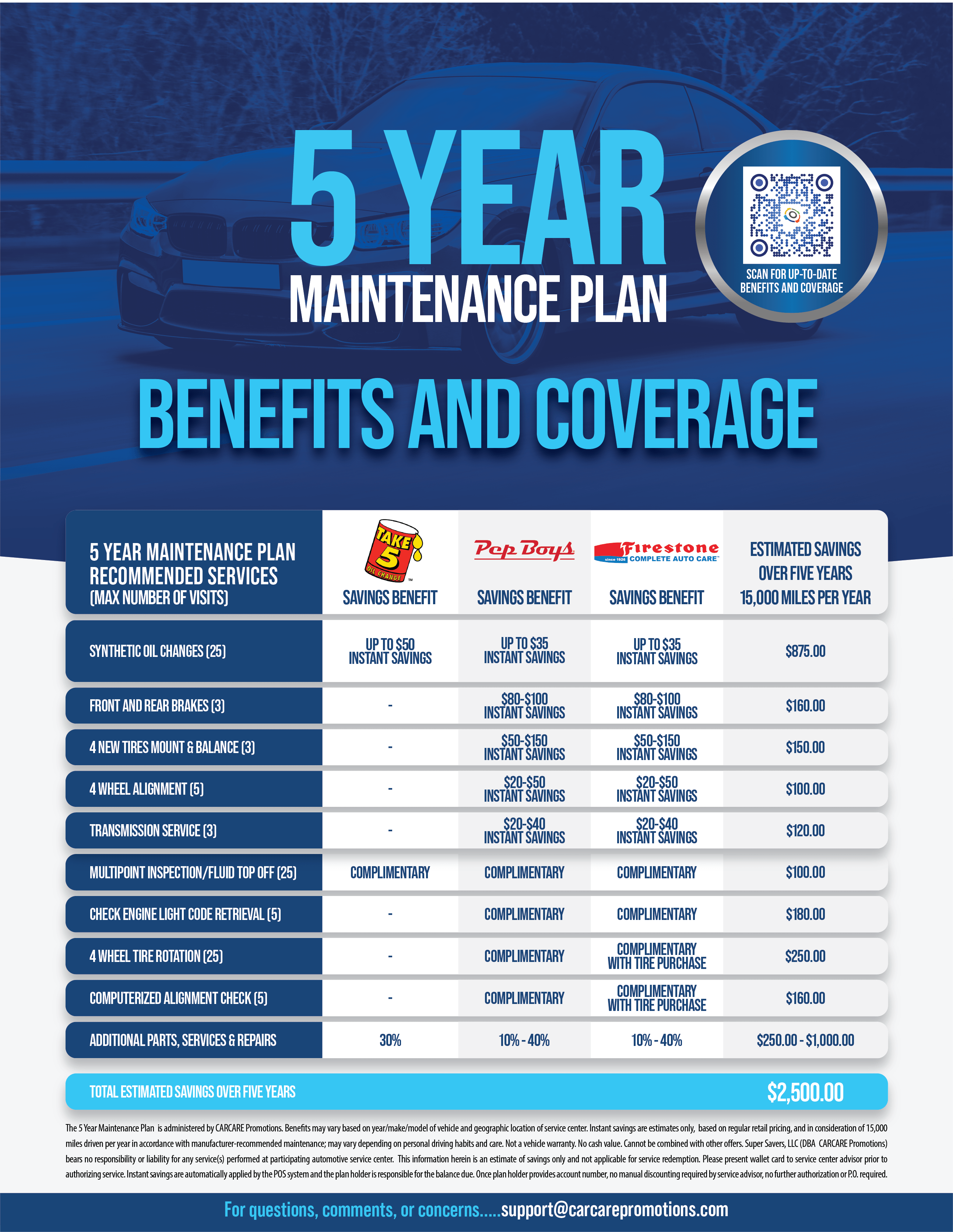 *The 5 Year Maintenance Plan is issued by Auto Source of Texas and administered by a third party. For questions, comments, or concerns with the 5 Year Maintenance Plan, please contact CARCARE Promotions at support@carcarepromotions.com.